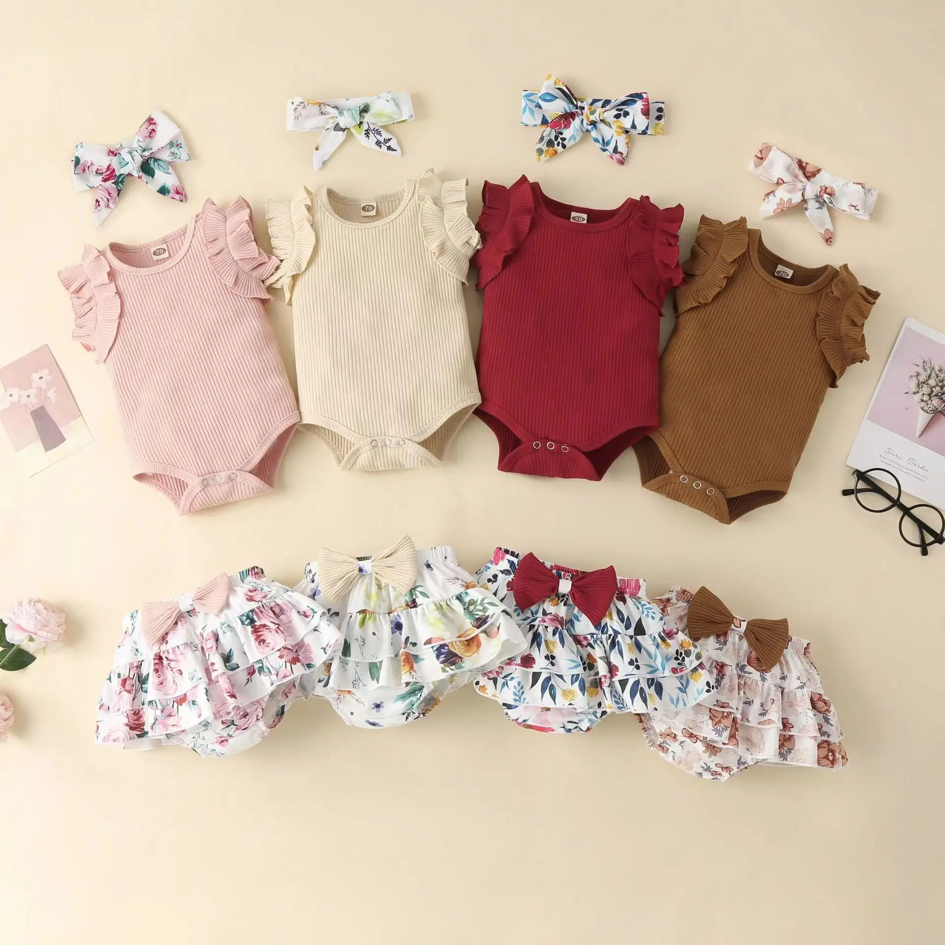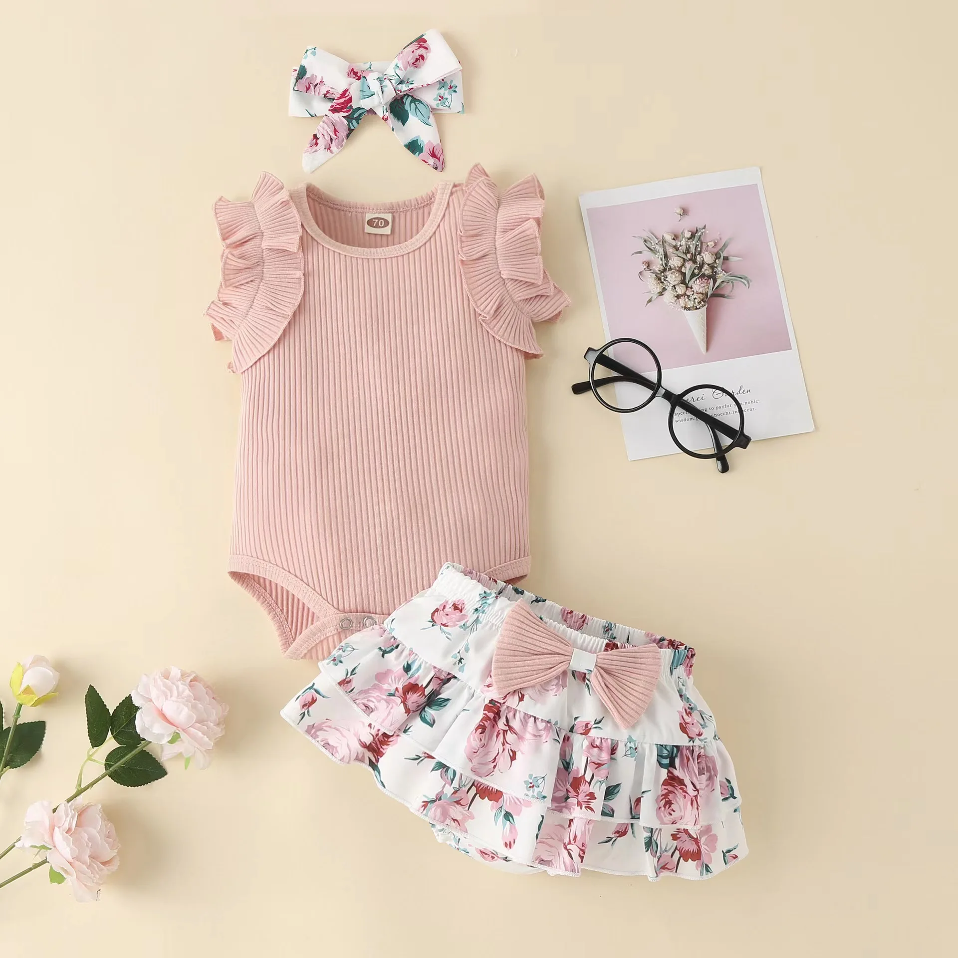 Conyson Одежда для новорожденных, детский хлопковый комбинезон с цветочным принтом для маленьких девочек, комбинезон с короткой повязкой на голову, комплект из 3 предметов
